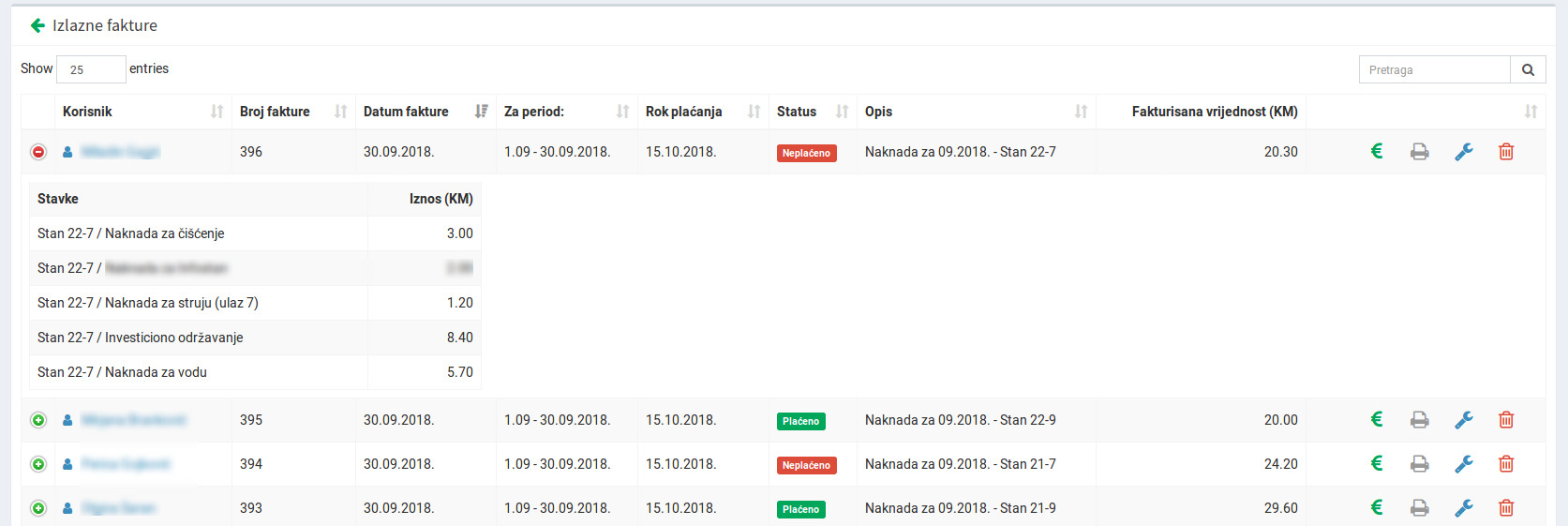U listi možete vidjeti sve detalje vezane za račun pa čak i stavke računa (klikom na ikonicu na početku reda)