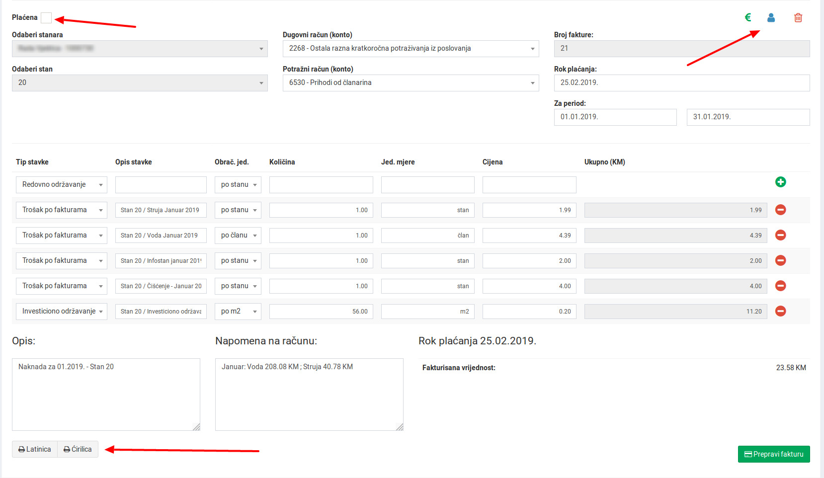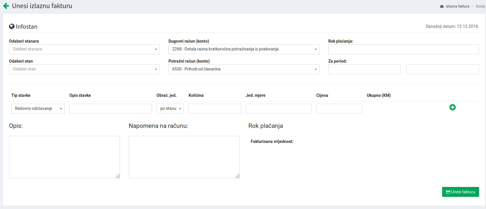 Odaberite Stanara, stan na koji se odnosi račun, odaberite dugovni i potražni račun (konto) te podesite rok plaćanja i period na koji se račun odnosi.