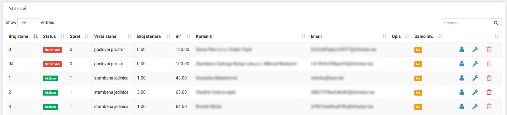 U tabeli možete vidjeti osnovne podatke o stanovima kao što su: vrsta, korisnik, opis, kvadratura i sl.