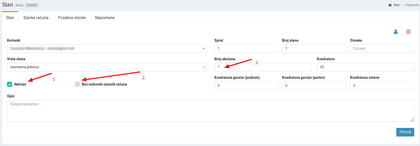Poder navedenih opcija, možete za svaki stan podesiti i Stavke računa, Posebne stavke ili unijeti i pregledati Napomene