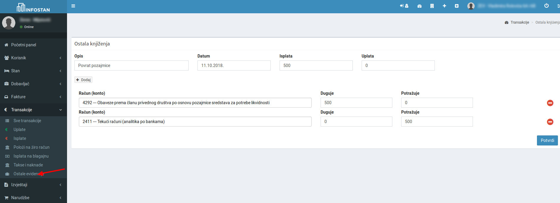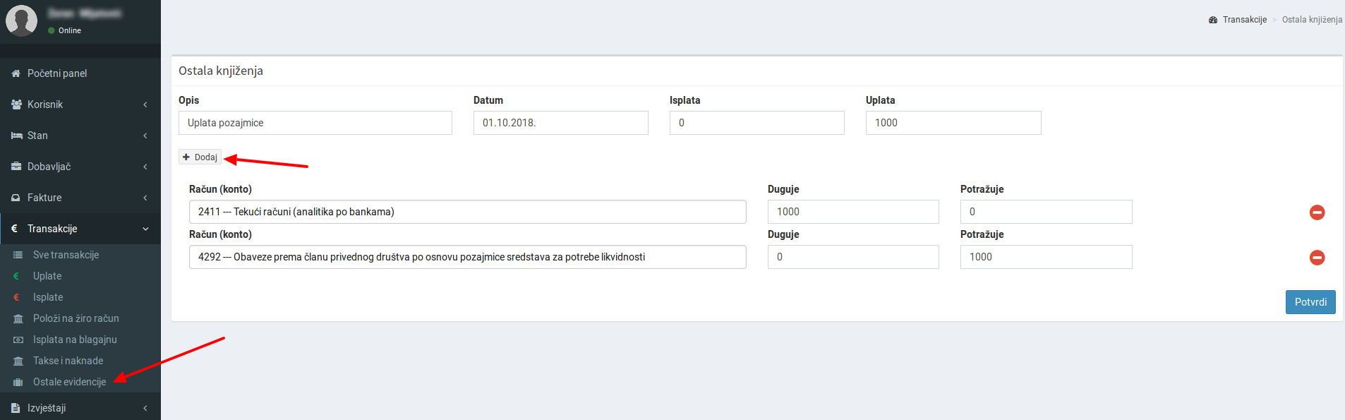 Nakon unosa, kliknite na Potvrdi. Vodite računa da iznos dugovne i potražne strane mora biti identičan.