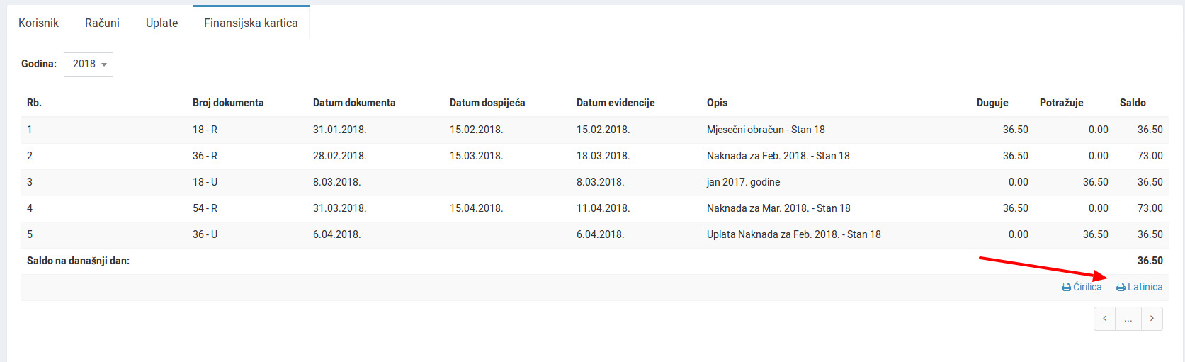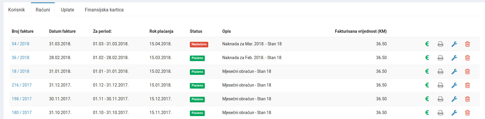 Na tab-u Računi možete vidjeti zadnja 24 računa korisnika (starije račune možete pronaći u sekciji Fakture → Izlazne fakture.