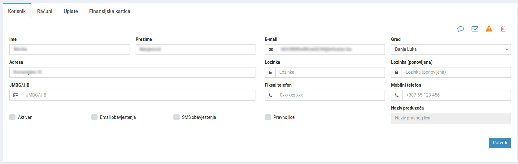 Nakon što kliknete na ikonicu za prepravku korisnika, otvoriće se forma sa podacima korisnika. JMBG broj se ne upisuje kod fizičkih lica i samo u slučaju da se radi o pravnom licu u ovo polje možete upisati JIB broj.
