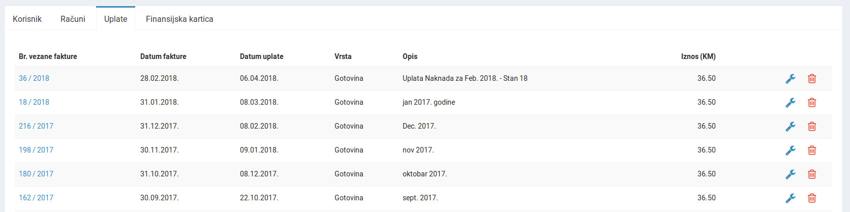 Za prepravku uplate kliknite na ikonicu za prepravku. Ukoliko želite obrisati uplatu, kliknite na ikonicu za brisanje. Račun koji je vezan za uplatu će se nakon brisanja uplate markirati kao Neplaćen