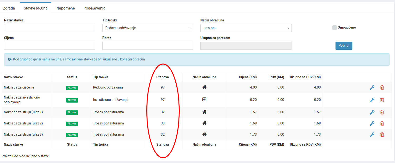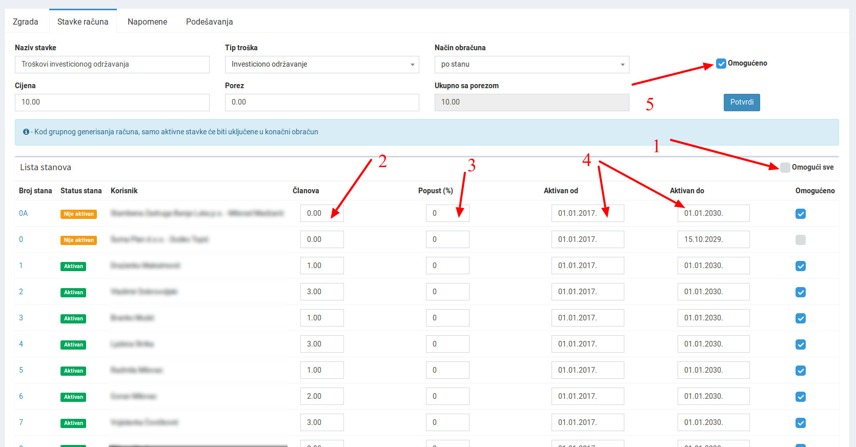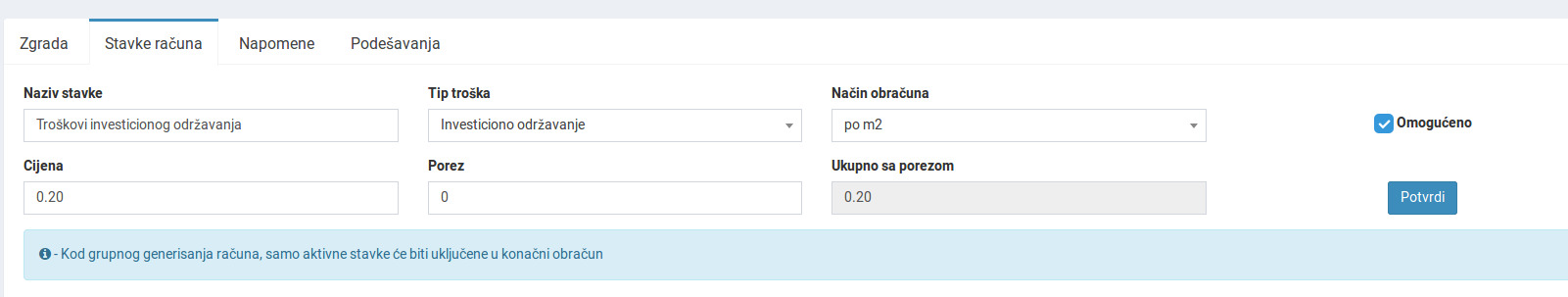 U narednim redovima ćemo pokazati kako se kreiraju pojedinačne stavke, kako se vežu za stanove i kako se po potrebi deaktiviraju