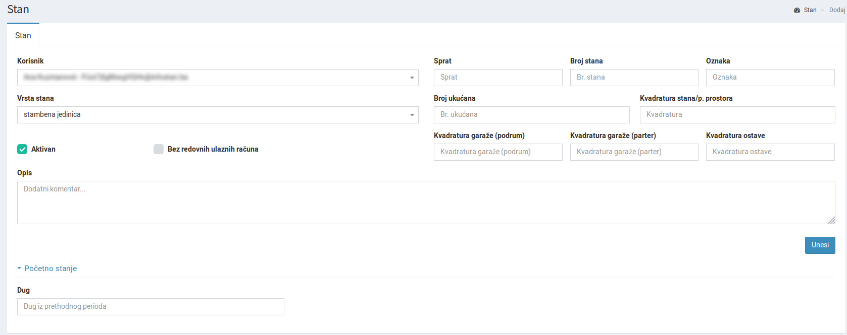 Za unos, kliknite u meniju sa strane na Stan pa odaberite opciju Dodaj.