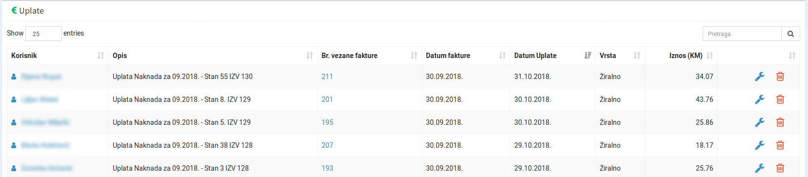U tabeli imate mogućnost da klikom na ime korisnika otvorite pregled samog korisnika ili da klikom na broj vezane fakture otvorite formu za pregled fakture.